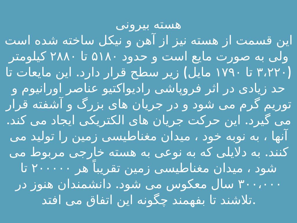 این قسمت از هسته نیز از آهن و نیکل ساخته شده است ولی به صورت مایع است و حدود ۵۱۸۰ تا ۲۸۸۰ کیلومتر (۳،۲۲۰ تا ۱۷۹۰ مایل) زیر سطح قرار دارد. این مایعات تا حد زیادی در اثر فروپاشی رادیواکتیو عناصر اورانیوم و توریم گرم می شود و در جریان های بزرگ و آشفته قرار می گیرد. این حرکت جریان های الکتریکی ایجاد می کند. آنها ، به نوبه خود ، میدان مغناطیسی زمین را تولید می کنند. به دلایلی که به نوعی به هسته خارجی مربوط می شود ، میدان مغناطیسی زمین تقریباً هر ۲۰۰۰۰۰ تا ۳۰۰،۰۰۰ سال معکوس می شود. دانشمندان هنوز در تلاشند تا بفهمند چگونه این اتفاق می افتد.