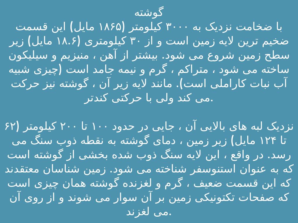 نزدیک لبه های بالایی آن ، جایی در حدود ۱۰۰ تا ۲۰۰ کیلومتر (۶۲ تا ۱۲۴ مایل) زیر زمین ، دمای گوشته به نقطه ذوب سنگ می رسد. در واقع ، این لایه سنگ ذوب شده بخشی از گوشته است که به عنوان استنوسفر شناخته می شود. زمین شناسان معتقدند که این قسمت ضعیف ، گرم و لغزنده گوشته همان چیزی است که صفحات تکتونیکی زمین بر آن سوار می شوند و از روی آن می لغزند.