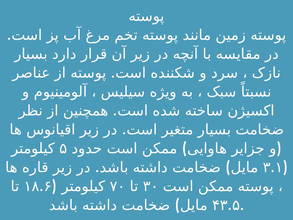 پوسته زمین مانند پوسته تخم مرغ آب پز است. در مقایسه با آنچه در زیر آن قرار دارد بسیار نازک ، سرد و شکننده است. پوسته از عناصر نسبتاً سبک ، به ویژه سیلیس ، آلومینیوم و اکسیژن ساخته شده است. همچنین از نظر ضخامت بسیار متغیر است. در زیر اقیانوس ها (و جزایر هاوایی) ممکن است حدود ۵ کیلومتر (۳.۱ مایل) ضخامت داشته باشد. در زیر قاره ها ، پوسته ممکن است ۳۰ تا ۷۰ کیلومتر (۱۸.۶ تا ۴۳.۵ مایل) ضخامت داشته باشد.