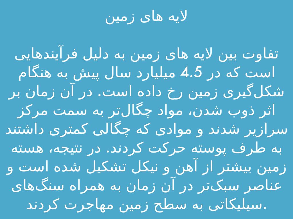 تفاوت بین لایه های زمین به دلیل فرآیندهایی است که در 4.5 میلیارد سال پیش به هنگام شکلگیری زمین رخ داده است. در آن زمان بر اثر ذوب شدن، مواد چگالتر به سمت مرکز سرازیر شدند و موادی که چگالی کمتری داشتند به طرف پوسته حرکت کردند. در نتیجه، هسته زمین بیشتر از آهن و نیکل تشکیل شده است و عناصر سبکتر در آن زمان به همراه سنگهای سیلیکاتی به سطح زمین مهاجرت کردند.
