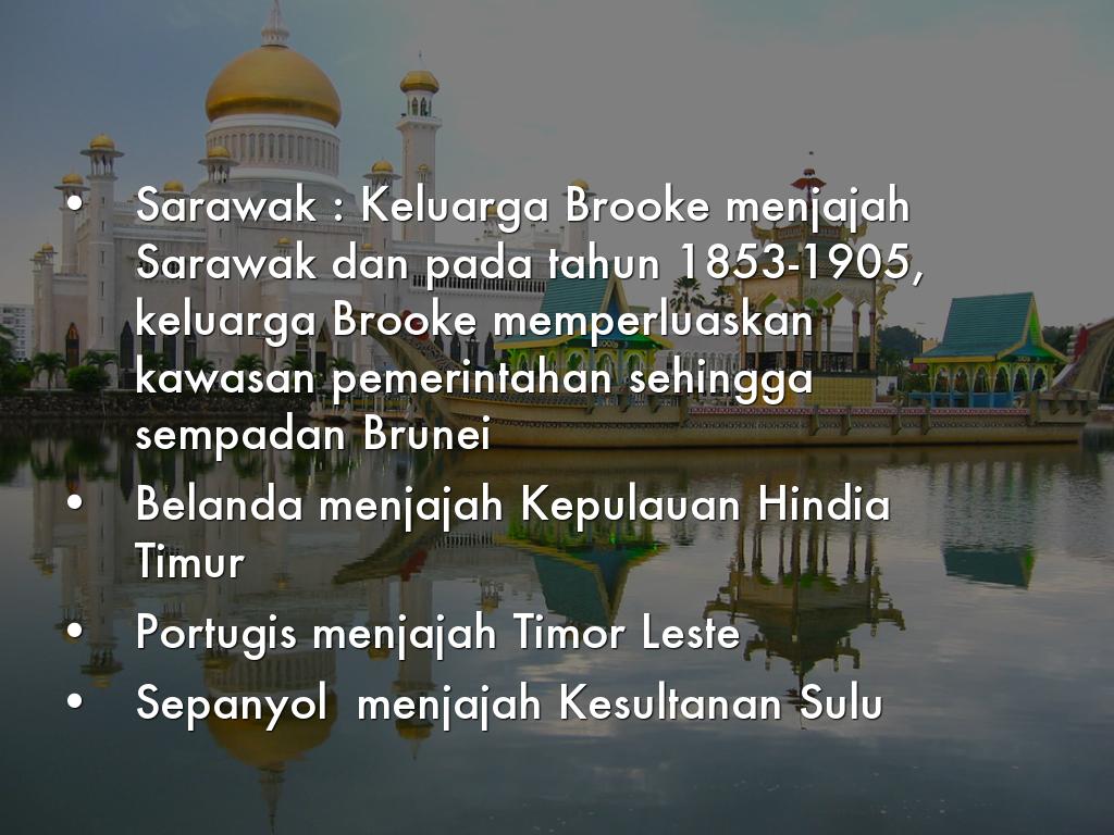 Sarawak : Keluarga Brooke menjajah Sarawak dan pada tahun 1853-1905, keluarga Brooke memperluaskan kawasan pemerintahan sehingga sempadan Brunei