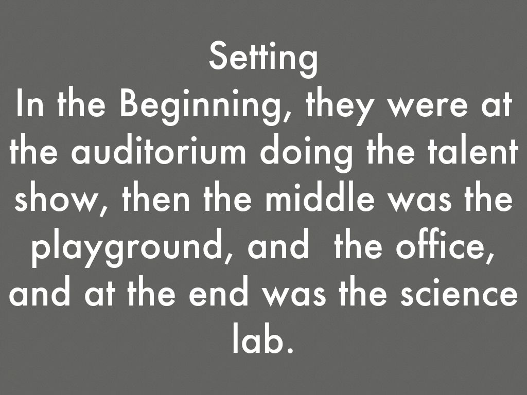 In the Beginning, they were at the auditorium doing the talent show, then the middle was the playground, and the office, and at the end was the science lab.