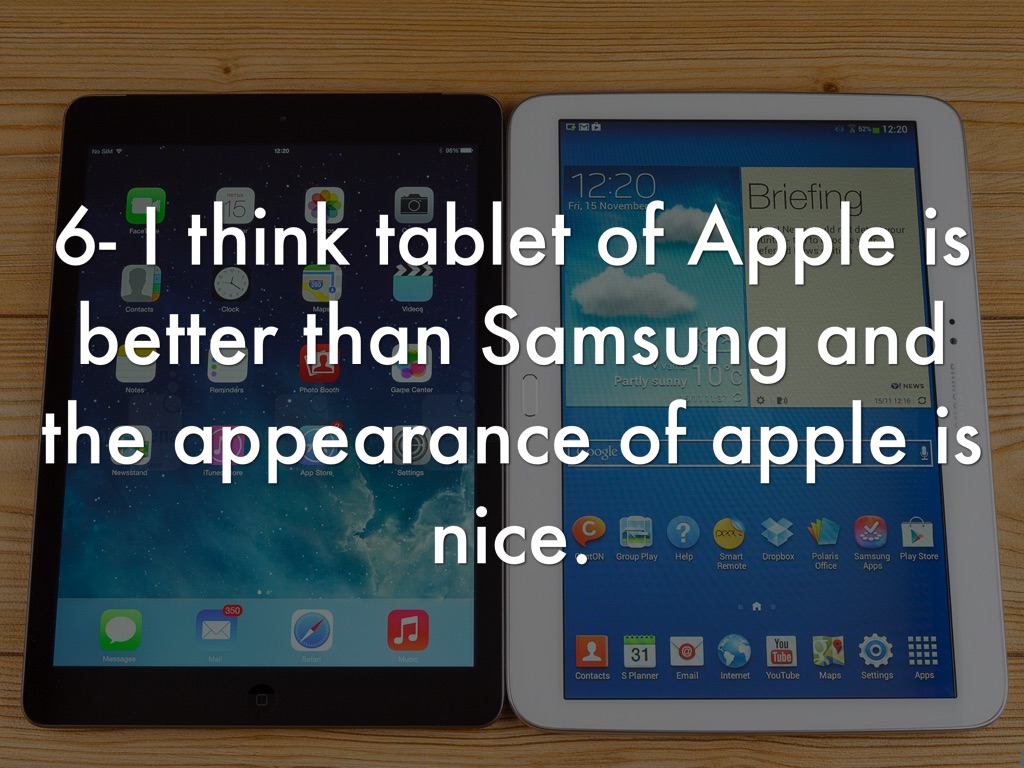 6- I think tablet of Apple is better than Samsung and the appearance of apple is nice.