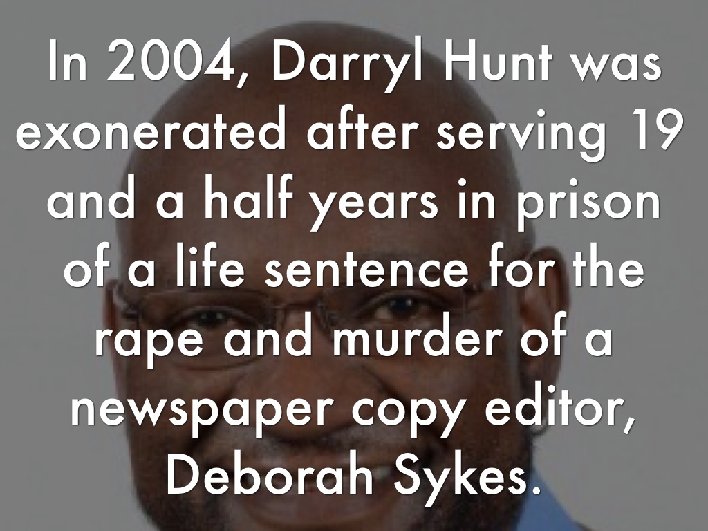 In 2004, Darryl Hunt was exonerated after serving 19 and a half years in prison of a life sentence for the rape and murder of a newspaper copy editor, Deborah Sykes.