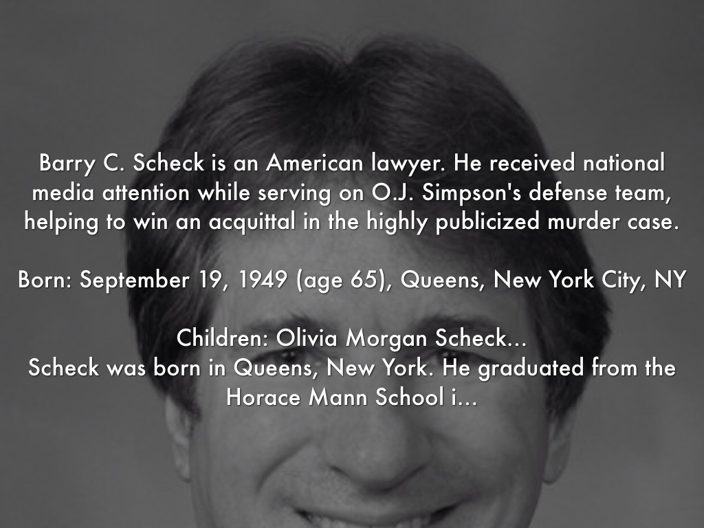 Barry C. Scheck is an American lawyer. He received national media attention while serving on O.J. Simpson's defense team, helping to win an acquittal in the highly publicized murder case.