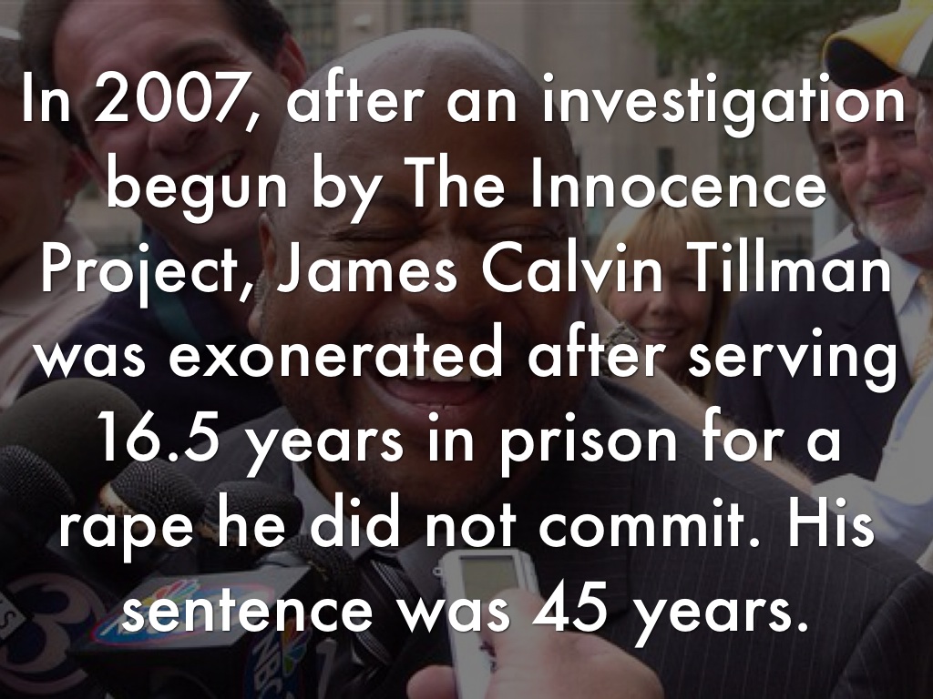 In 2007, after an investigation begun by The Innocence Project, James Calvin Tillman was exonerated after serving 16.5 years in prison for a rape he did not commit. His sentence was 45 years.