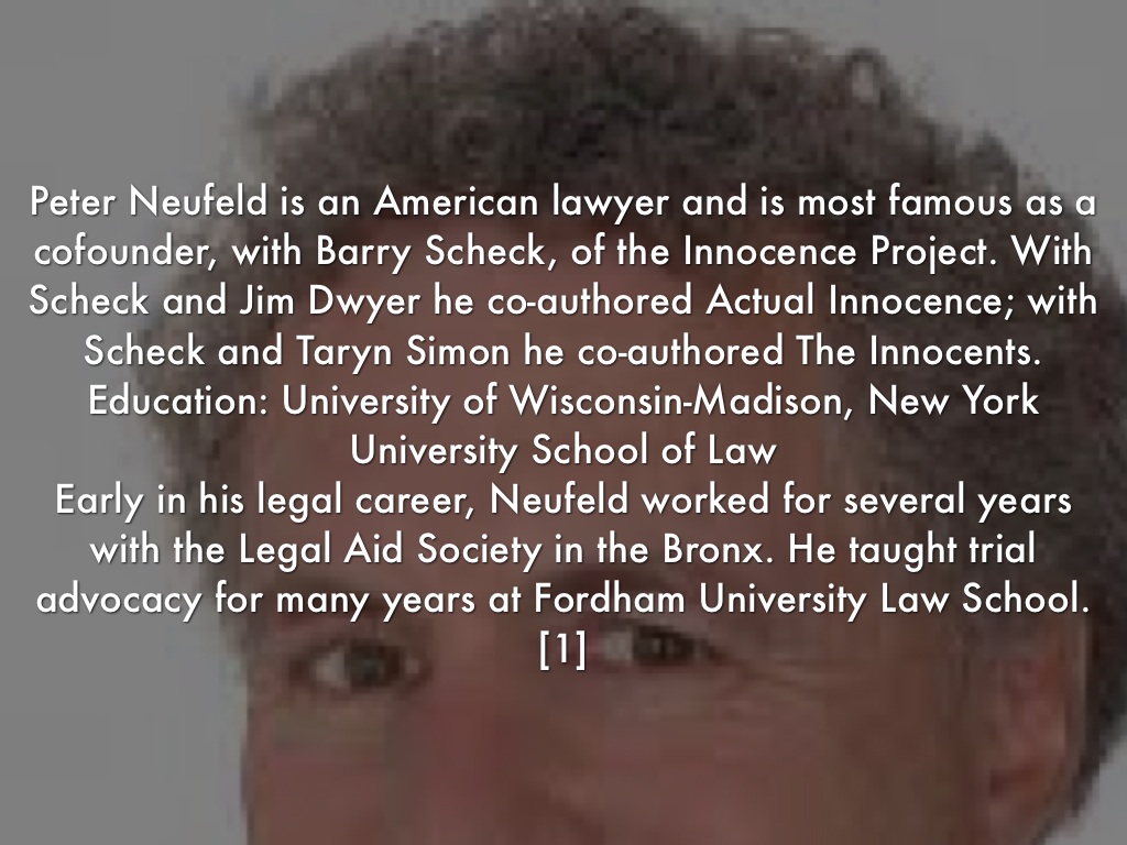 Peter Neufeld is an American lawyer and is most famous as a cofounder, with Barry Scheck, of the Innocence Project. With Scheck and Jim Dwyer he co-authored Actual Innocence; with Scheck and Taryn Simon he co-authored The Innocents.