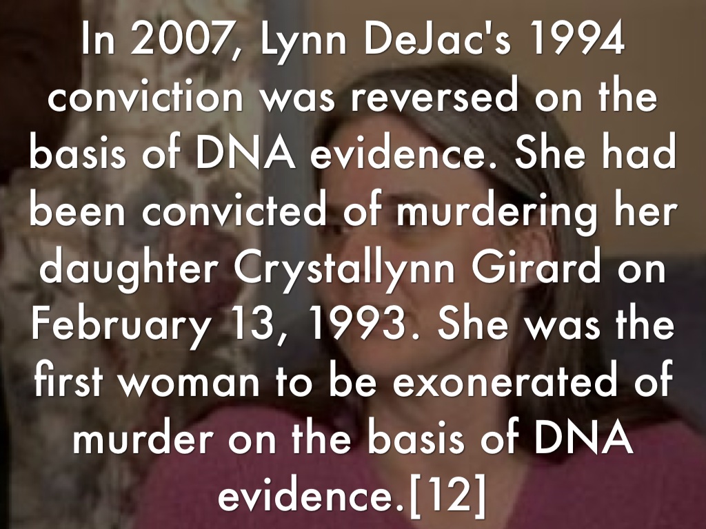 In 2007, Lynn DeJac's 1994 conviction was reversed on the basis of DNA evidence. She had been convicted of murdering her daughter Crystallynn Girard on February 13, 1993. She was the first woman to be exonerated of murder on the basis of DNA evidence.[12]
