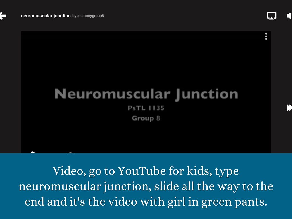 Video, go to YouTube for kids, type neuromuscular junction, slide all the way to the end and it's the video with girl in green pants.
