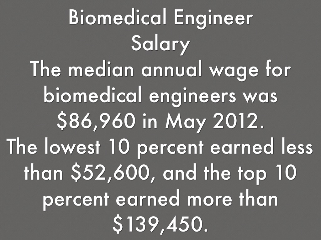 The median annual wage for biomedical engineers was $86,960 in May 2012.