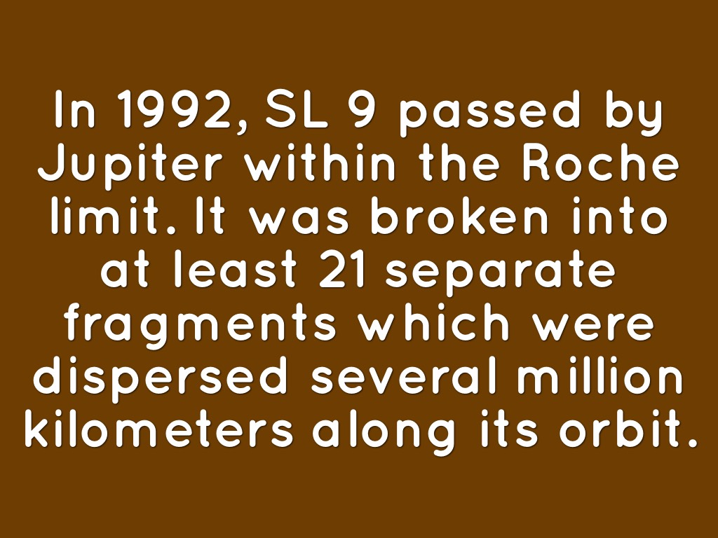 In 1992, SL 9 passed by Jupiter within the Roche limit. It was broken into at least 21 separate fragments which were dispersed several million kilometers along its orbit.