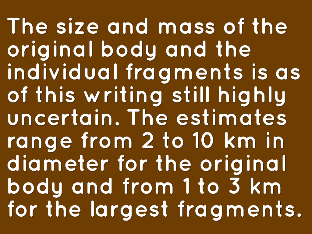 The size and mass of the original body and the individual fragments is as of this writing still highly uncertain. The estimates range from 2 to 10 km in diameter for the original body and from 1 to 3 km for the largest fragments.