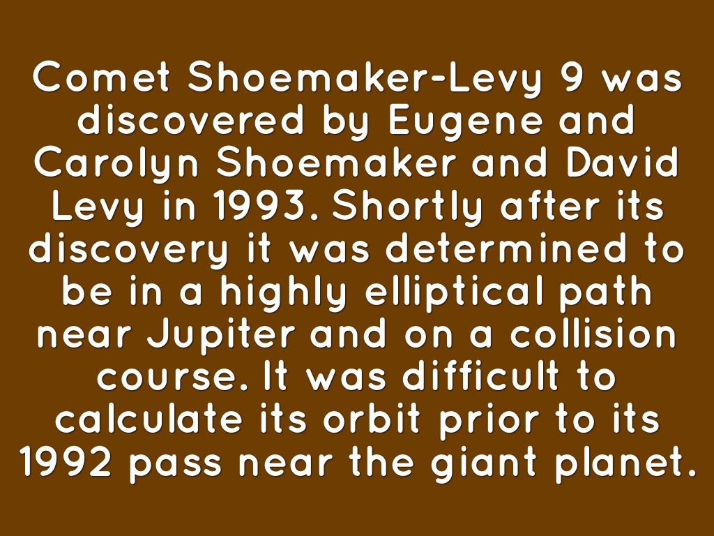 Comet Shoemaker-Levy 9 was discovered by Eugene and Carolyn Shoemaker and David Levy in 1993. Shortly after its discovery it was determined to be in a highly elliptical path near Jupiter and on a collision course. It was difficult to calculate its orbit prior to its 1992 pass near the giant planet.