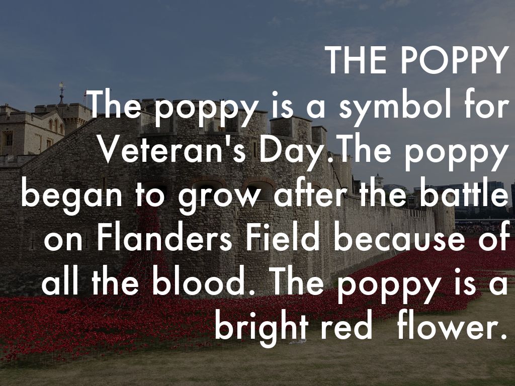 The poppy is a symbol for Veteran's Day.The poppy began to grow after the battle on Flanders Field because of all the blood. The poppy is a bright red flower.