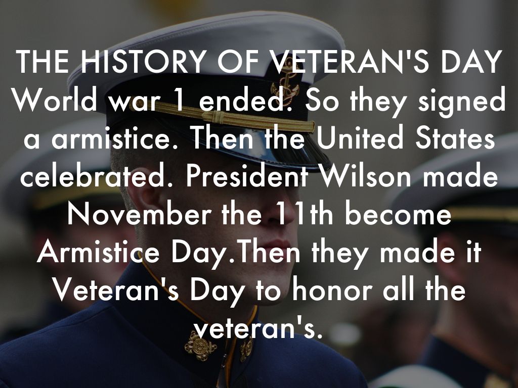 World war 1 ended. So they signed a armistice. Then the United States celebrated. President Wilson made November the 11th become Armistice Day.Then they made it Veteran's Day to honor all the veteran's.