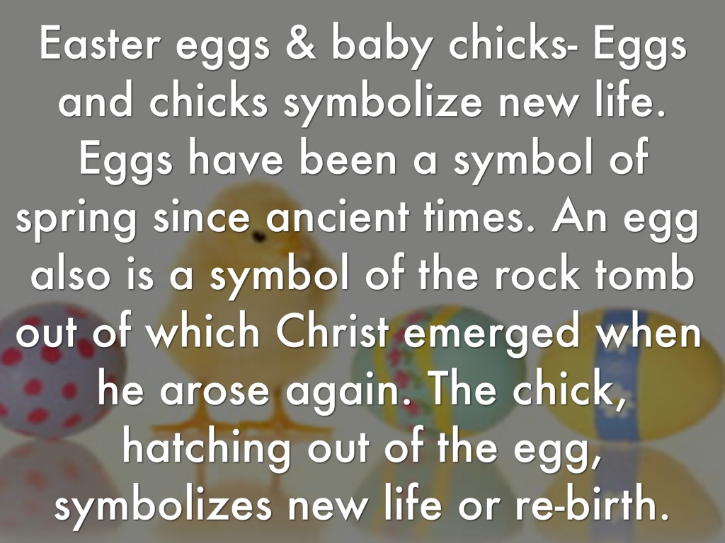 Easter eggs & baby chicks- Eggs and chicks symbolize new life. Eggs have been a symbol of spring since ancient times. An egg also is a symbol of the rock tomb out of which Christ emerged when he arose again. The chick, hatching out of the egg, symbolizes new life or re-birth.