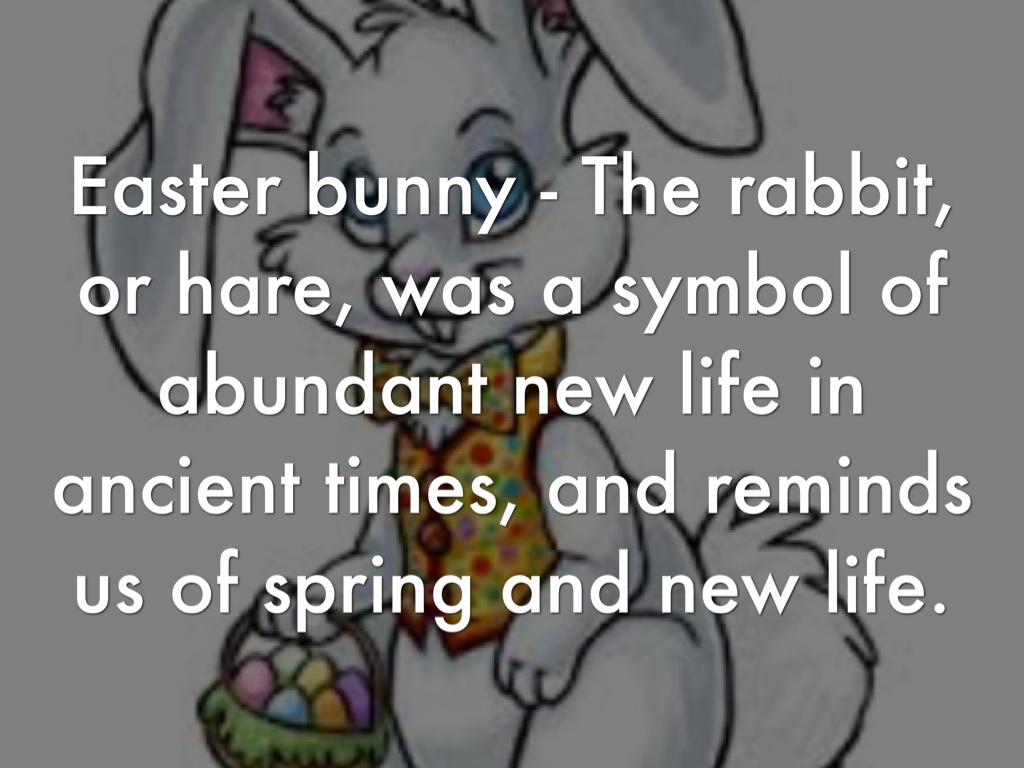 Easter bunny - The rabbit, or hare, was a symbol of abundant new life in ancient times, and reminds us of spring and new life.