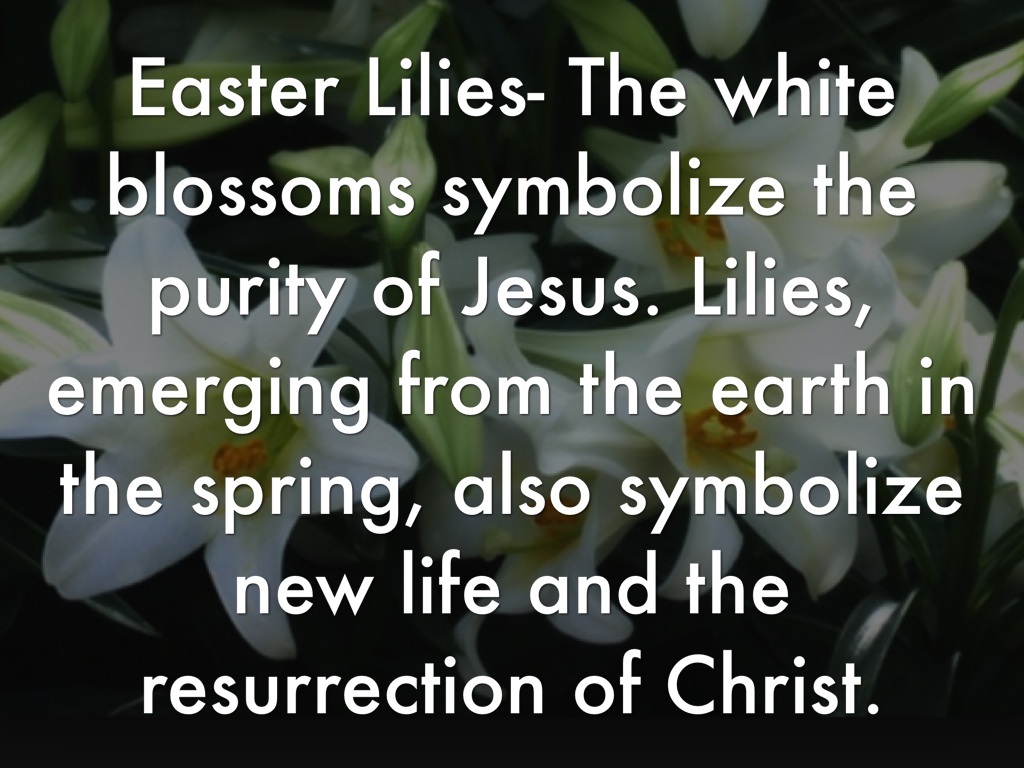 Easter Lilies- The white blossoms symbolize the purity of Jesus. Lilies, emerging from the earth in the spring, also symbolize new life and the resurrection of Christ.