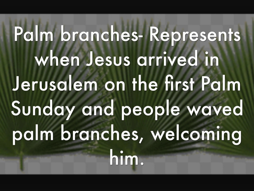Palm branches- Represents when Jesus arrived in Jerusalem on the first Palm Sunday and people waved palm branches, welcoming him.
