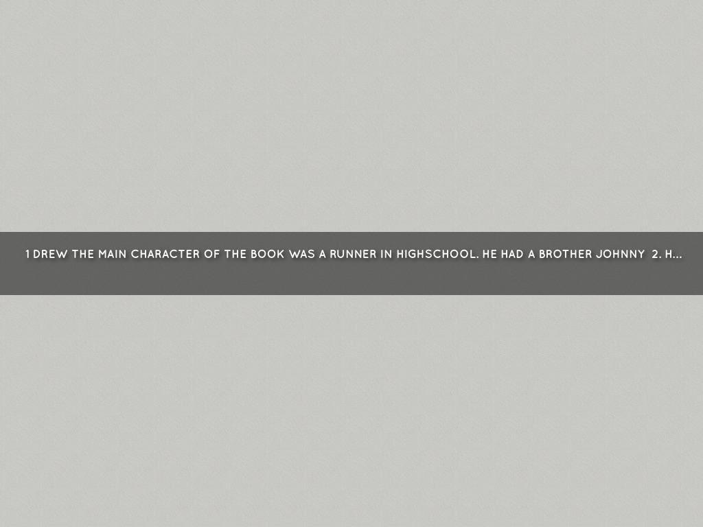1 DREW THE MAIN CHARACTER OF THE BOOK WAS A RUNNER IN HIGHSCHOOL. HE HAD A BROTHER JOHNNY 2. HIS BROTHER WOULD MAKE HIM RUN TO THIS SMALL TOWN NEAR BY THAT WAS ABOUT 5 MILES AWAY TO GET SOME MONEY FROM THIS GUY THAT HELPED HIS FAMILY OUT WITH BILLS AND OTHER STUFF 3. AFTER A FEW DAYS DREW GOT KICKED OUT OF THE TRACK TEAM BECAUSE HE GOT IN A FIGHT WITH ANOTHER KID FOR MAKING HIM MAD SO COACH COALMENN WAS WATCHING HIM RUN CAUSE DREW WOULD TRAIN A LOT . COACH AND DREW STARED WORKING TOGETHER AND DREW RAN THE 400 METER IN TRACK BUT HIS COACH SAID HE SHOULD RUN THE MILE HIS MILE TIME WAS 5:00 MINUTES BUT HE WANTED TO MAKE IT 4 SO HE TRAINS AND TRAINS AND IT COMES FOR THE DAY OF THE TRACK MEAT OF CORSE HE WAS NOT ON IT BUT HE WAS GOING TO SE IF HE COULD BET ONE OF THE FASTEST MILERS.