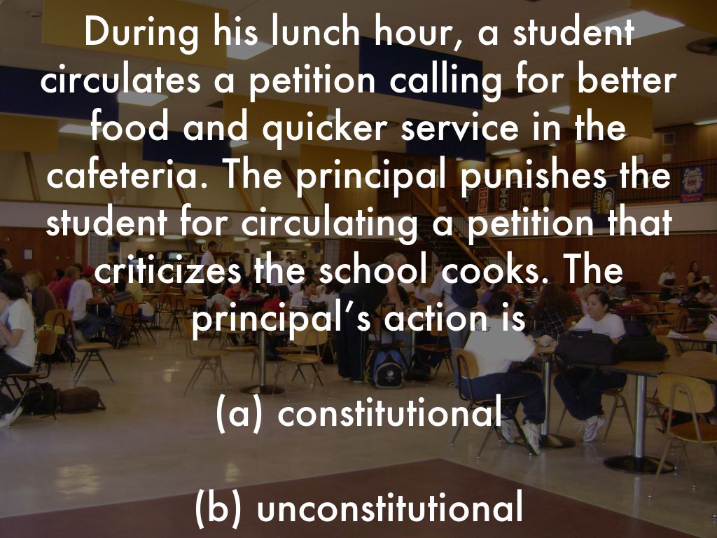 During his lunch hour, a student circulates a petition calling for better food and quicker service in the cafeteria. The principal punishes the student for circulating a petition that criticizes the school cooks. The principal’s action is
