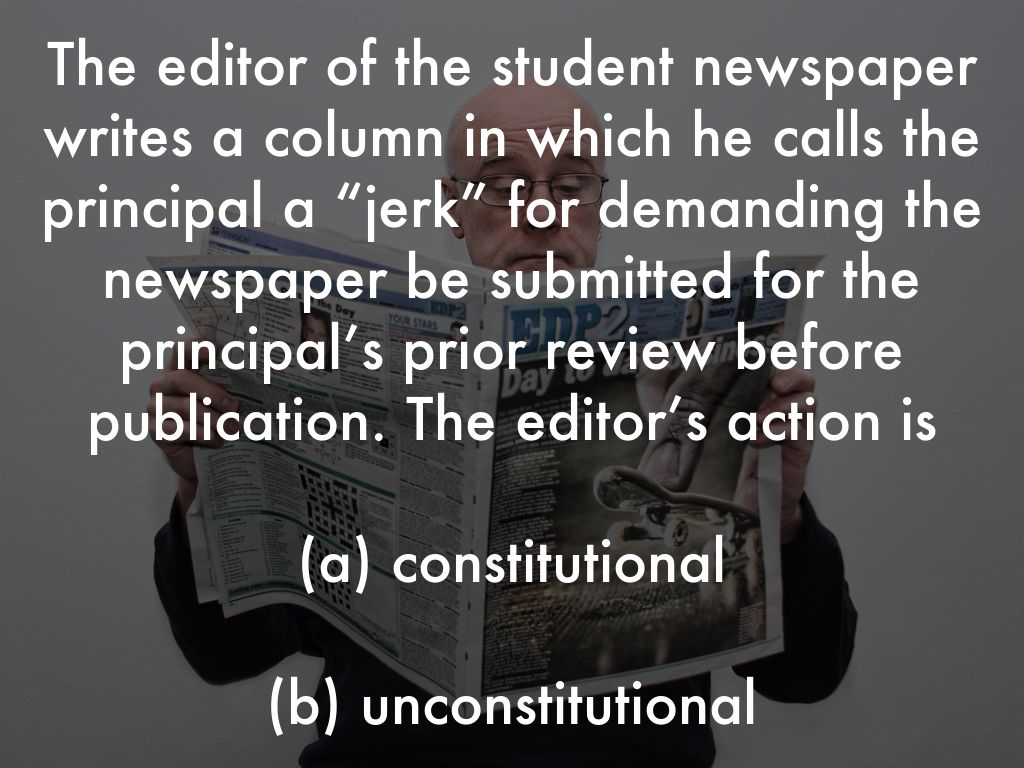 The editor of the student newspaper writes a column in which he calls the principal a “jerk” for demanding the newspaper be submitted for the principal’s prior review before publication. The editor’s action is