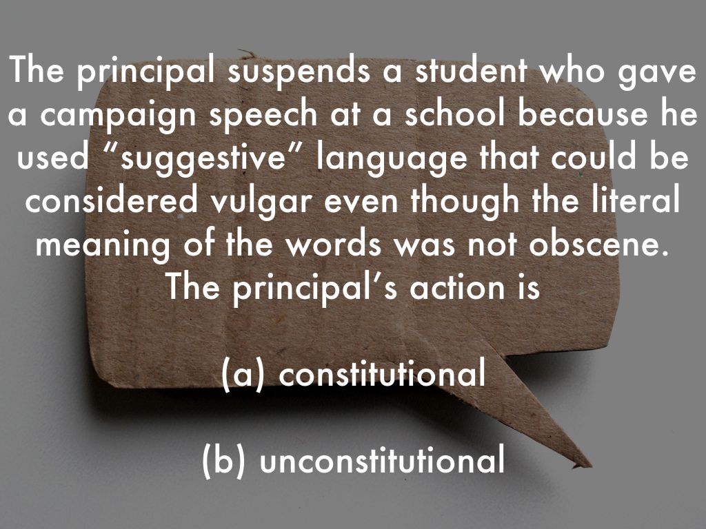 The principal suspends a student who gave a campaign speech at a school because he used “suggestive” language that could be considered vulgar even though the literal meaning of the words was not obscene. The principal’s action is