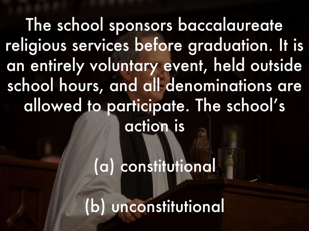 The school sponsors baccalaureate religious services before graduation. It is an entirely voluntary event, held outside school hours, and all denominations are allowed to participate. The school’s action is