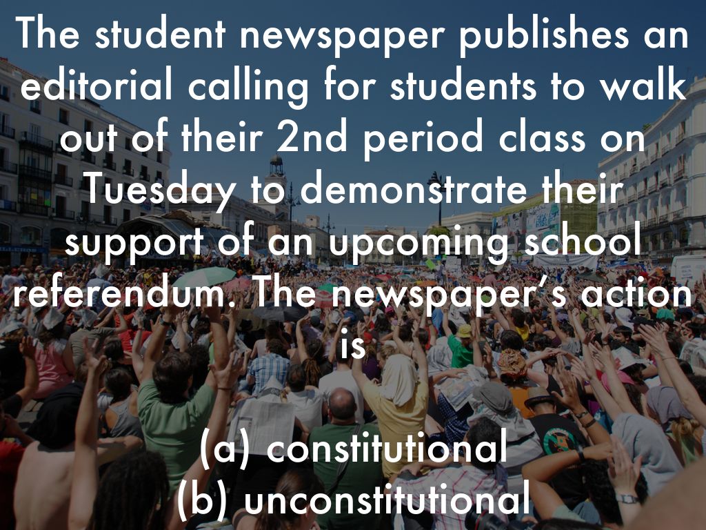 The student newspaper publishes an editorial calling for students to walk out of their 2nd period class on Tuesday to demonstrate their support of an upcoming school referendum. The newspaper’s action is
