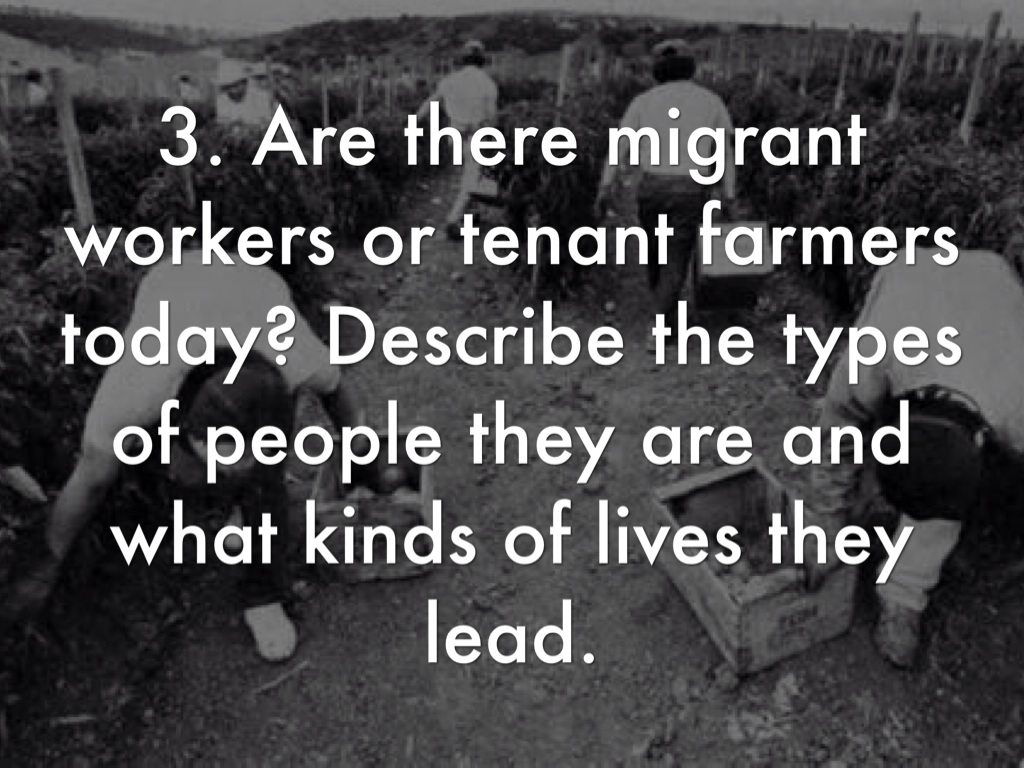 3. Are there migrant workers or tenant farmers today? Describe the types of people they are and what kinds of lives they lead.