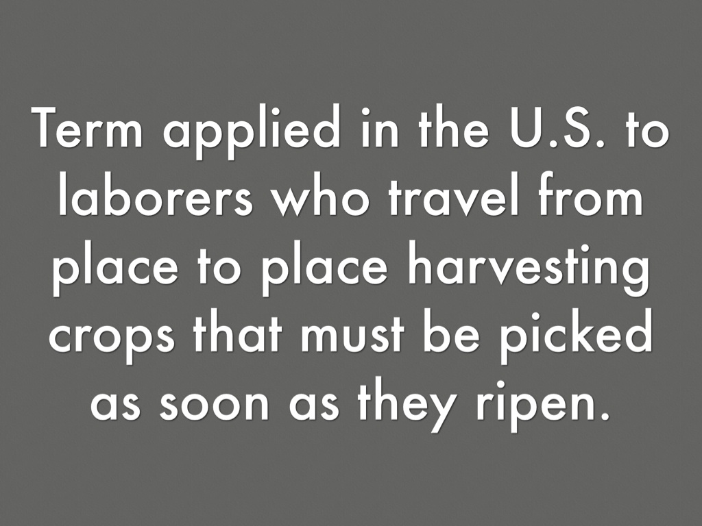Term applied in the U.S. to laborers who travel from place to place harvesting crops that must be picked as soon as they ripen.