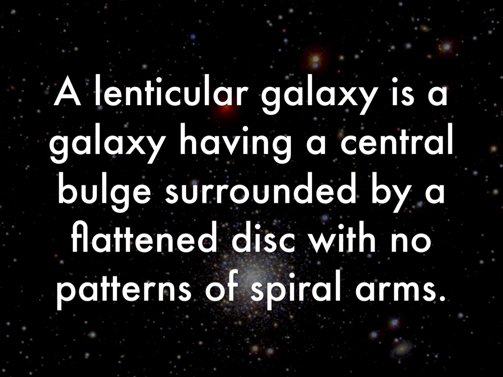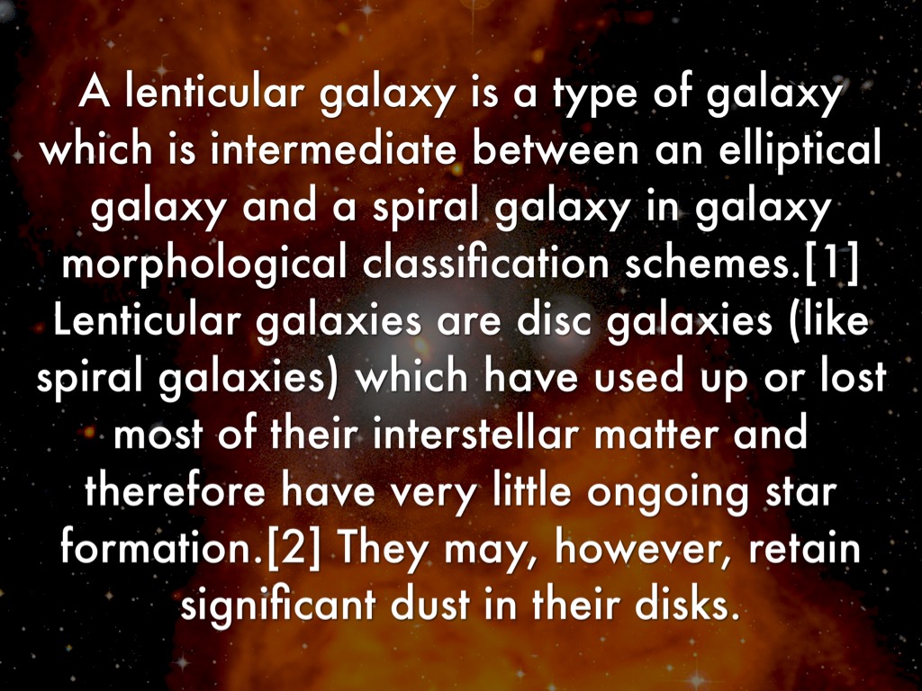 A lenticular galaxy is a type of galaxy which is intermediate between an elliptical galaxy and a spiral galaxy in galaxy morphological classification schemes.[1] Lenticular galaxies are disc galaxies (like spiral galaxies) which have used up or lost most of their interstellar matter and therefore have very little ongoing star formation.[2] They may, however, retain significant dust in their disks.