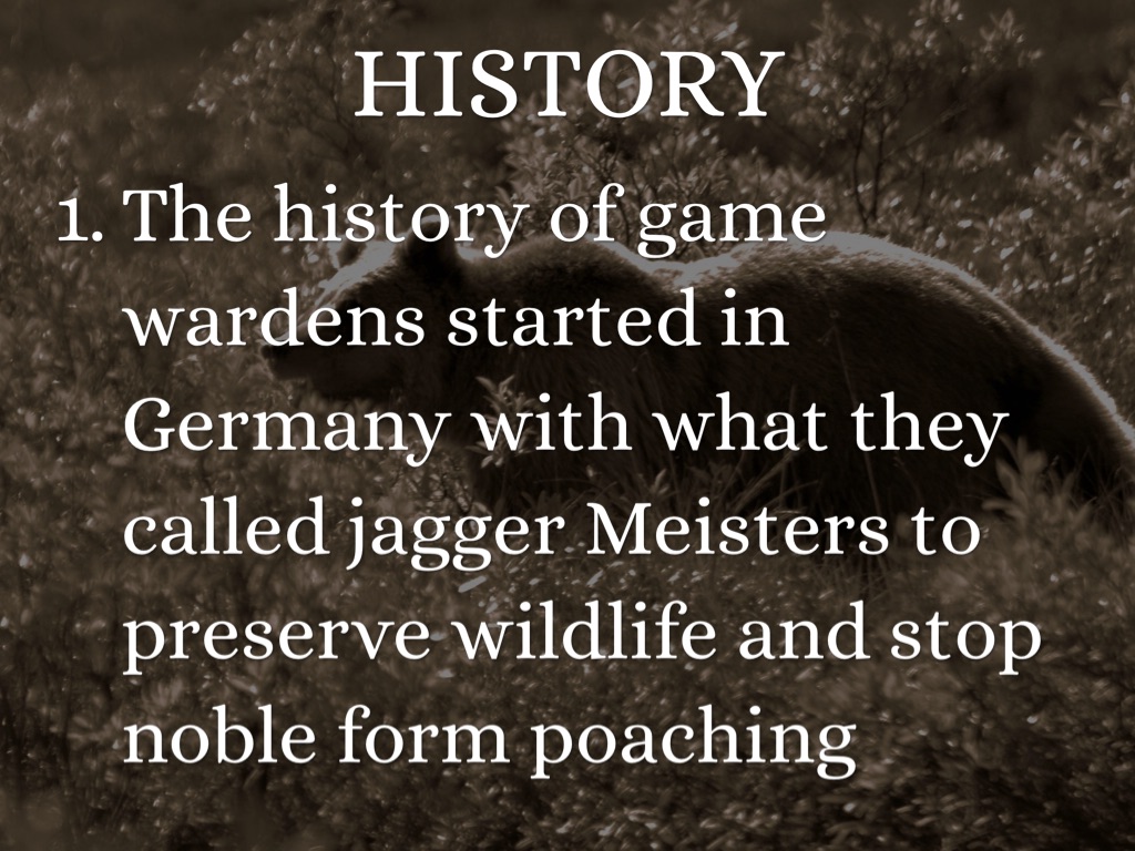 The history of game wardens started in Germany with what they called jagger Meisters to preserve wildlife and stop noble form poaching