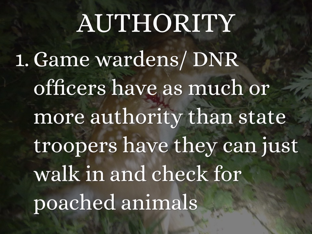 Game wardens/ DNR officers have as much or more authority than state troopers have they can just walk in and check for poached animals