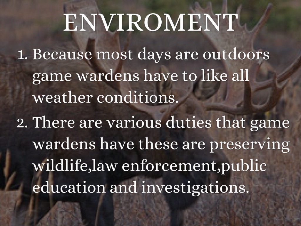 There are various duties that game wardens have these are preserving wildlife,law enforcement,public education and investigations.