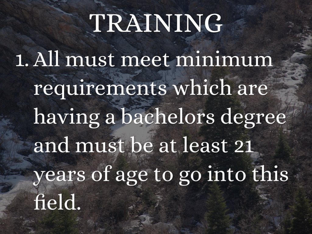 All must meet minimum requirements which are having a bachelors degree and must be at least 21 years of age to go into this field.