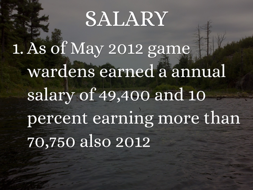 As of May 2012 game wardens earned a annual salary of 49,400 and 10 percent earning more than 70,750 also 2012