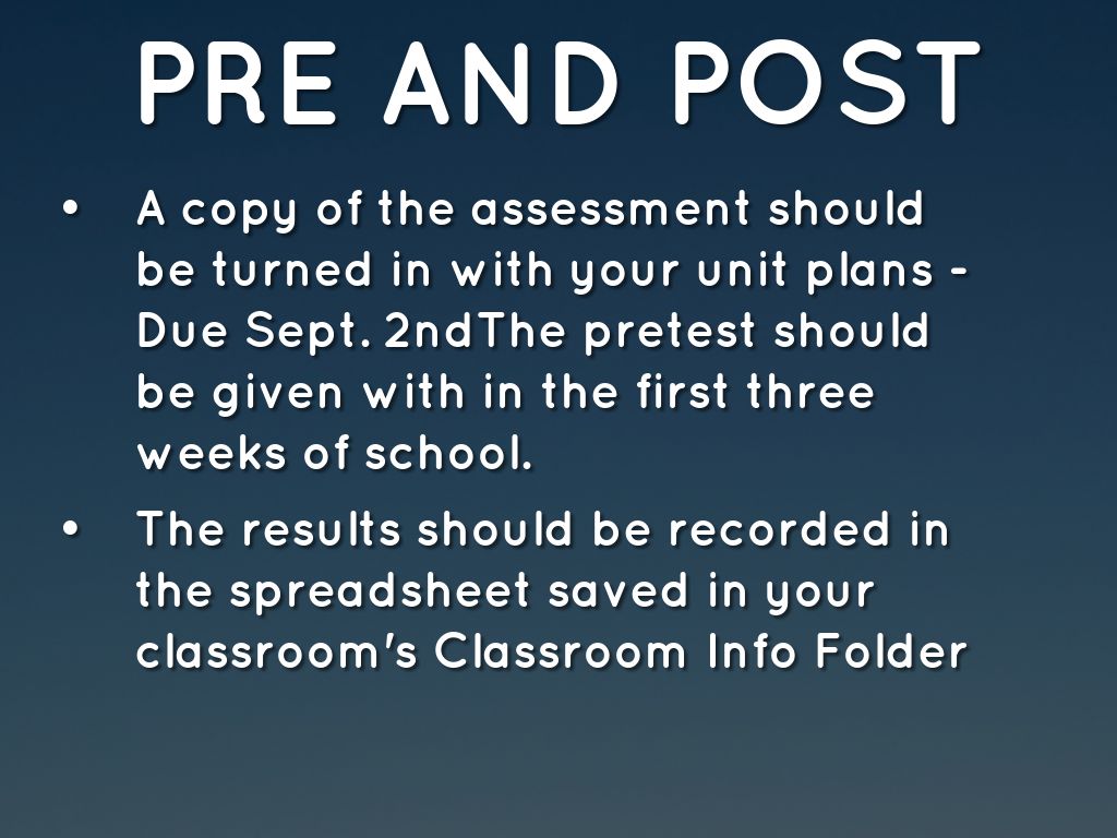 • A copy of the assessment should be turned in with your unit plans - Due Sept. 2ndThe pretest should be given with in the first three weeks of school.