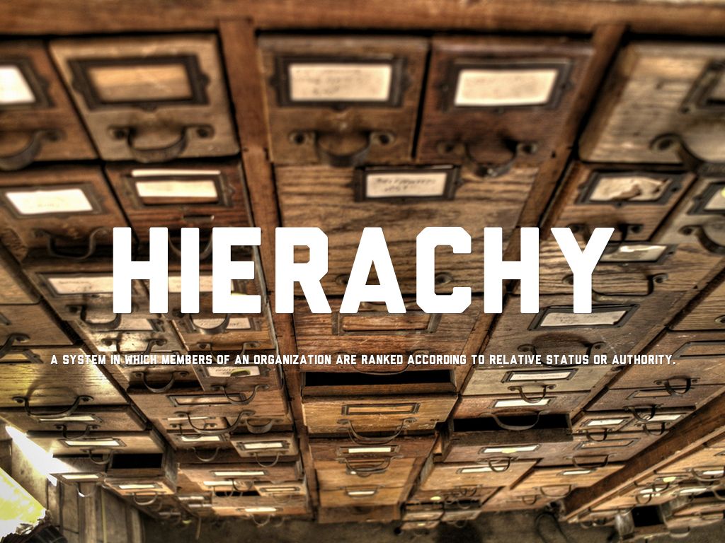 A SYSTEM IN WHICH MEMBERS OF AN ORGANIZATION ARE RANKED ACCORDING TO RELATIVE STATUS OR AUTHORITY.