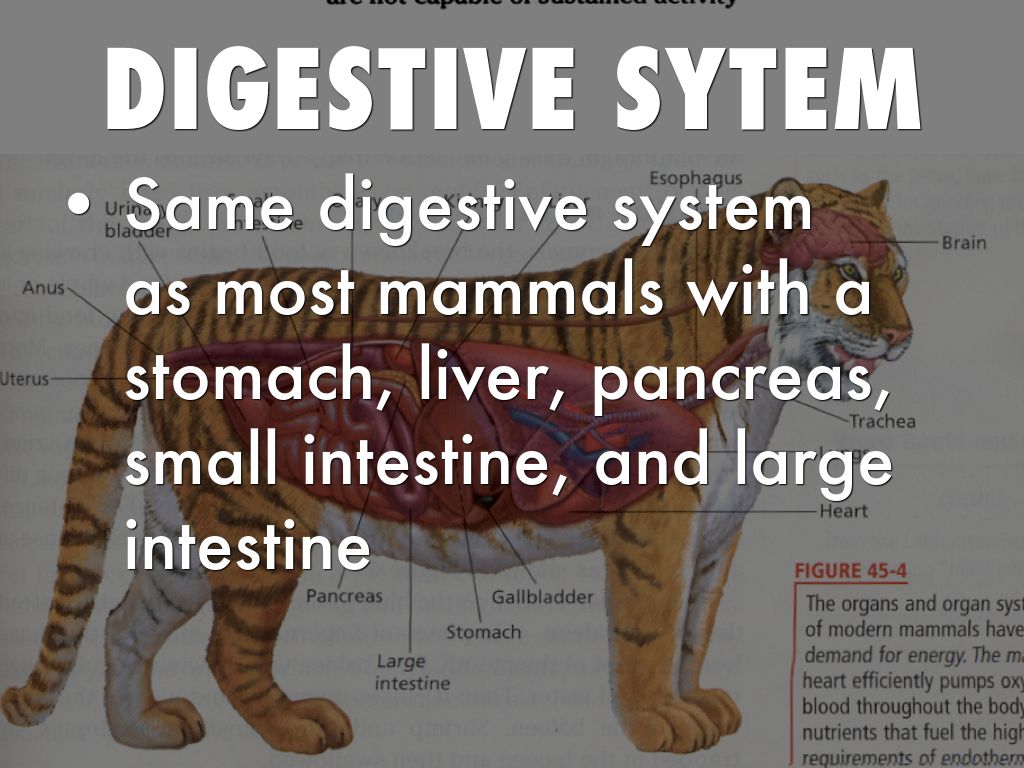 Same digestive system as most mammals with a stomach, liver, pancreas, small intestine, and large intestine