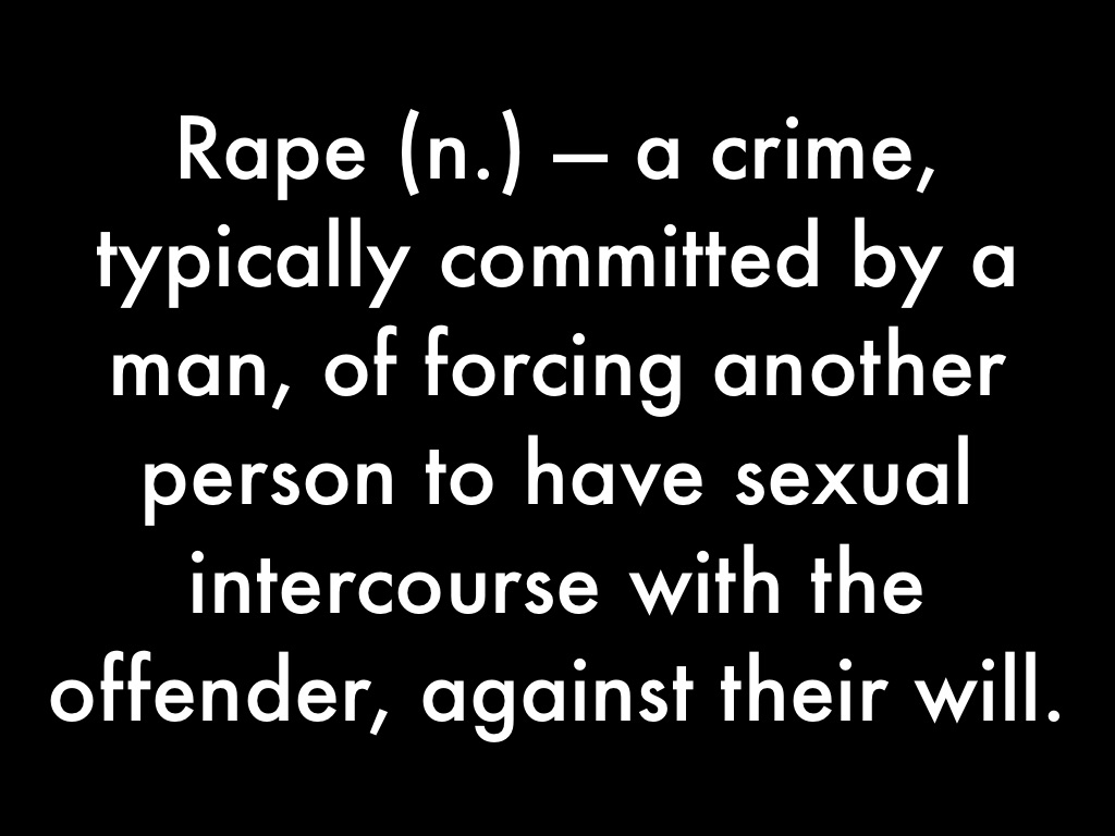 Rape (n.) — a crime, typically committed by a man, of forcing another person to have sexual intercourse with the offender, against their will.