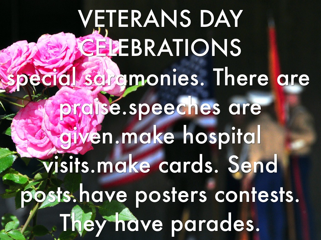 VETERANS DAY CELEBRATIONS special saramonies. There are praise.speeches are given.make hospital visits.make cards. Send posts.have posters contests. They have parades.