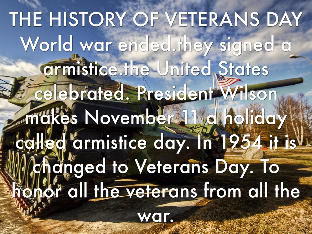 THE HISTORY OF VETERANS DAY World war ended.they signed a armistice.the United States celebrated. President Wilson makes November 11 a holiday called armistice day. In 1954 it is changed to Veterans Day. To honor all the veterans from all the war.