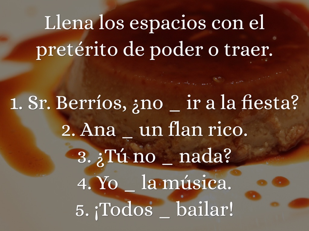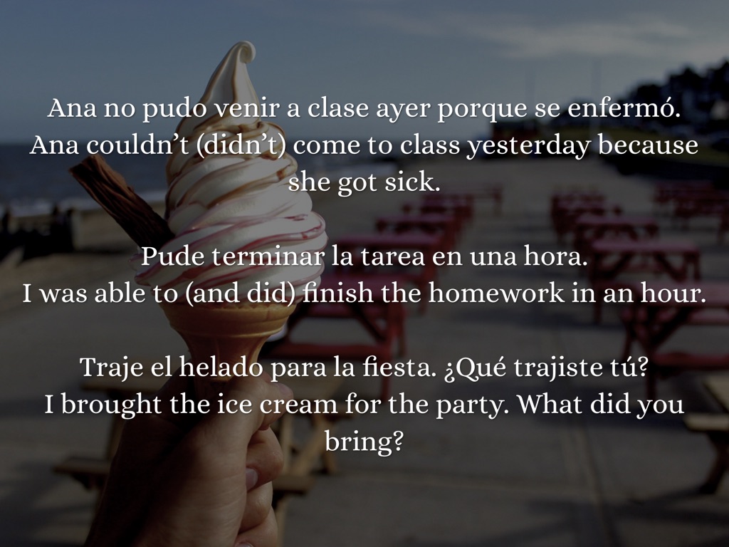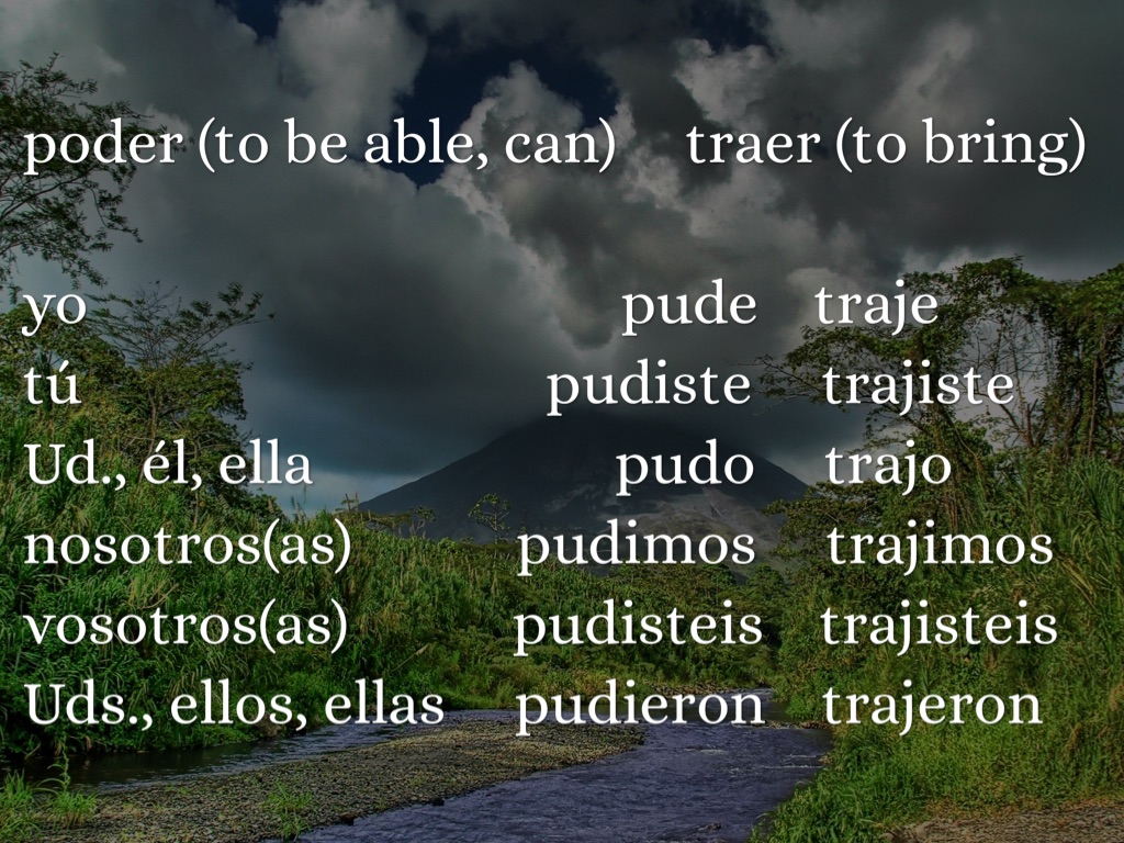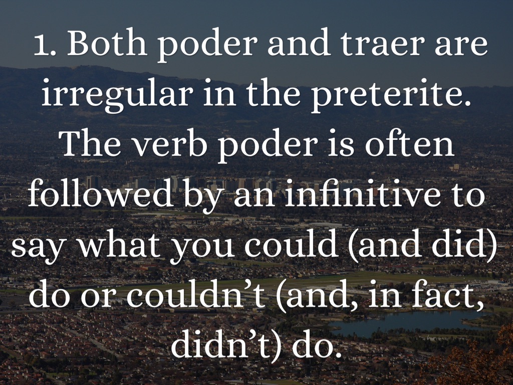 1. Both poder and traer are irregular in the preterite. The verb poder is often followed by an infinitive to say what you could (and did) do or couldn’t (and, in fact, didn’t) do.