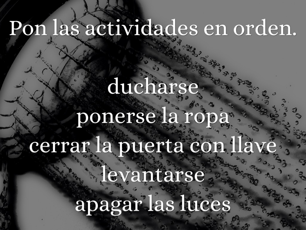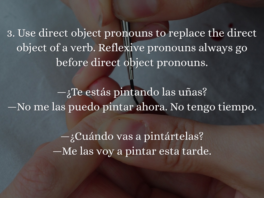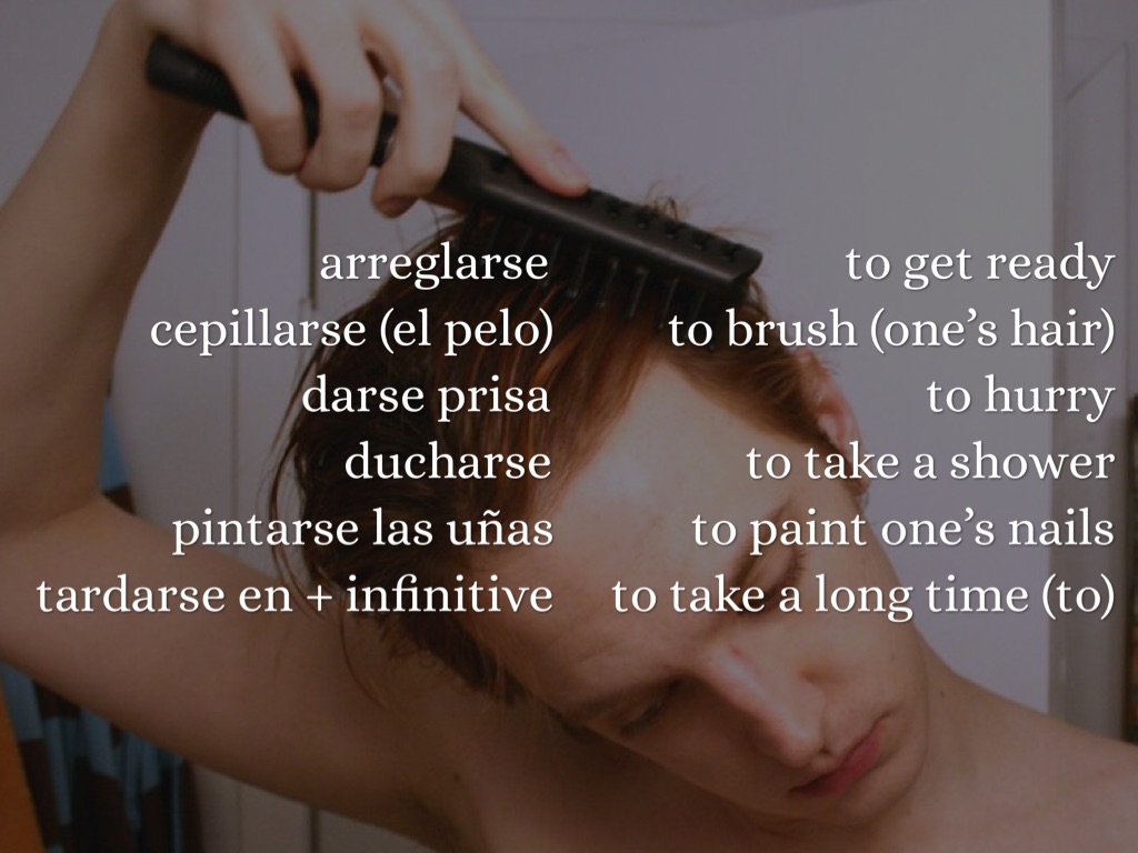 arreglarse to get ready cepillarse (el pelo) to brush (one’s hair) darse prisa to hurry ducharse to take a shower pintarse las uñas to paint one’s nails tardarse en + infinitive to take a long time (to)