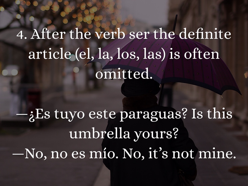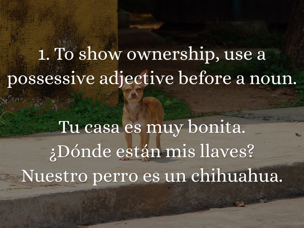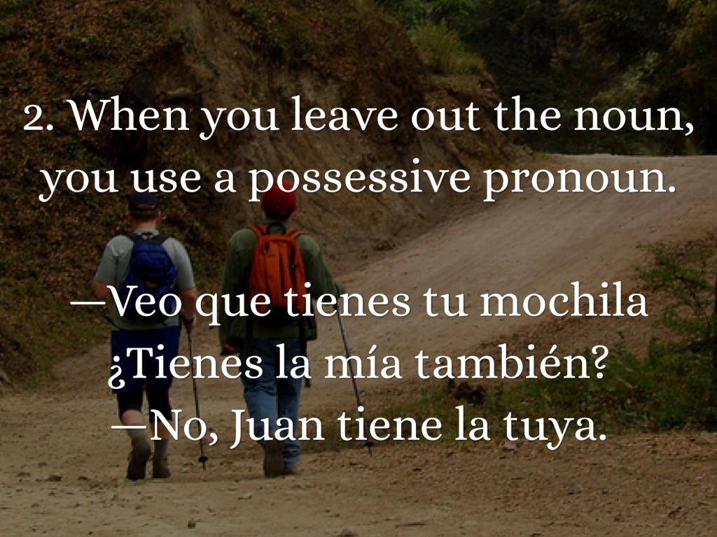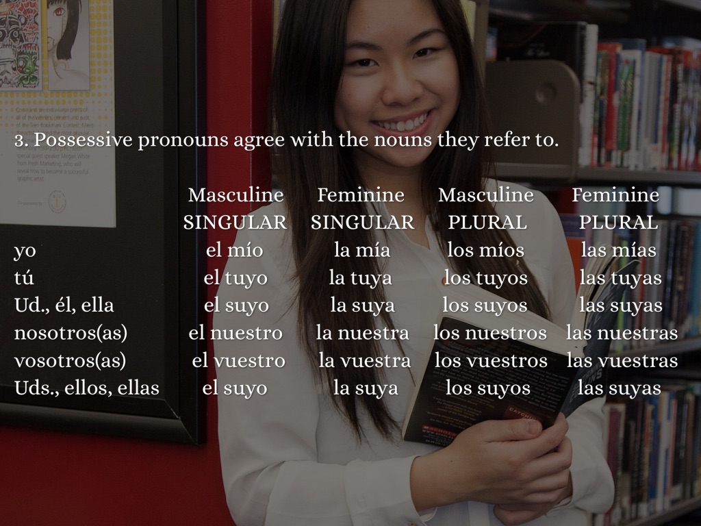Masculine Feminine Masculine Feminine SINGULAR SINGULAR PLURAL PLURAL yo el mío la mía los míos las mías tú el tuyo la tuya los tuyos las tuyas Ud., él, ella el suyo la suya los suyos las suyas nosotros(as) el nuestro la nuestra los nuestros las nuestras vosotros(as) el vuestro la vuestra los vuestros las vuestras Uds., ellos, ellas el suyo la suya los suyos las suyas