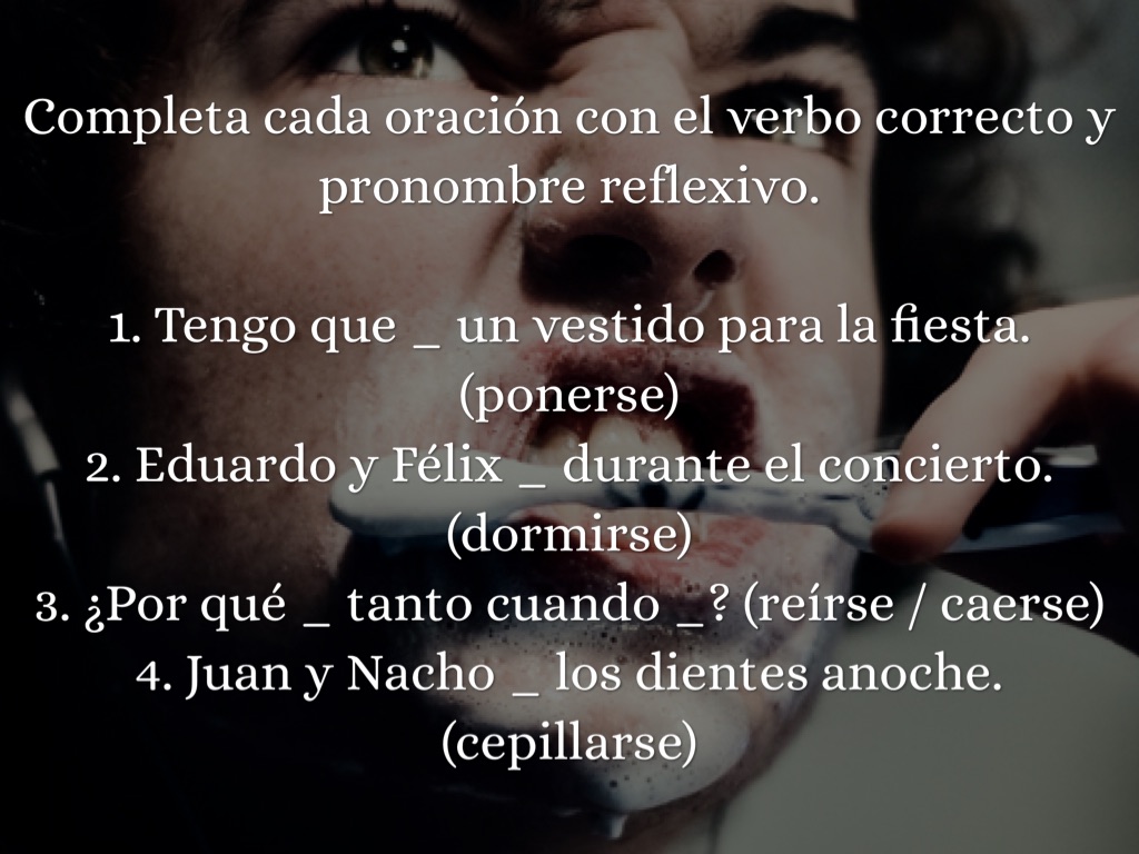 1. Tengo que _ un vestido para la fiesta. (ponerse) 2. Eduardo y Félix _ durante el concierto. (dormirse) 3. ¿Por qué _ tanto cuando _? (reírse / caerse) 4. Juan y Nacho _ los dientes anoche. (cepillarse)