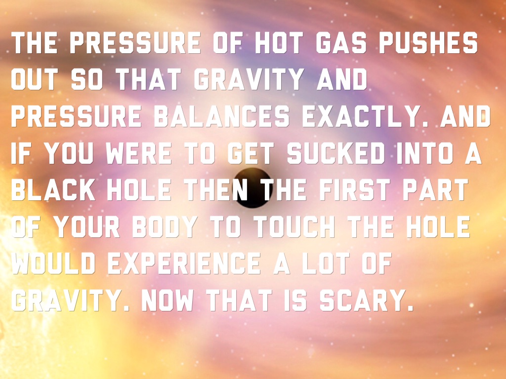 The pressure of hot gas pushes out so that gravity and pressure balances exactly. And if you were to get sucked into a black hole then the first part of your body to touch the hole would experience a lot of gravity. Now that is scary.