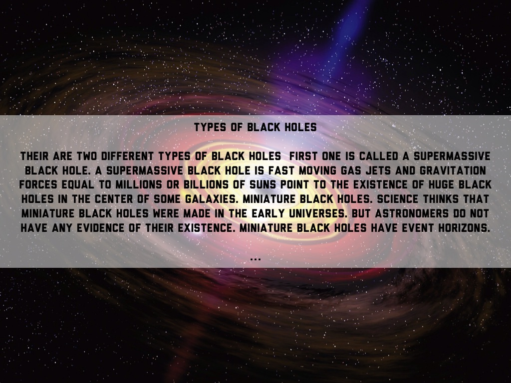 Their are two different types of black holes first one is called a supermassive black hole. A supermassive black hole is fast moving gas jets and gravitation forces equal to millions or billions of suns point to the existence of huge black holes in the center of some galaxies. Miniature black holes. Science thinks that miniature black holes were made in the early universes. But astronomers do not have any evidence of their existence. Miniature black holes have event horizons.