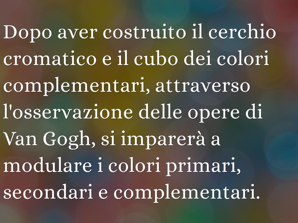 Dopo aver costruito il cerchio cromatico e il cubo dei colori complementari, attraverso l'osservazione delle opere di Van Gogh, si imparerà a modulare i colori primari, secondari e complementari.